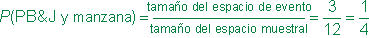 | Problema | Barry se ofrece para preparar almuerzos para los voluntarios de una caminata para caridad. En cada bolsa pone: · uno de dos sándwiches (mantequilla de maní y jalea, o pavo con queso), · una de tres bolsas de papas (papas regulares, papas horneadas, o papas con sal), · una fruta (manzana o naranja). Olvidó marcar qué había en cada bolsa. Suponiendo que cada elección es igualmente probable, ¿cuál es la probabilidad de que a Therese le toque una bolsa con sándwich de mantequilla de maní y jalea (PB&J) y una manzana? | |