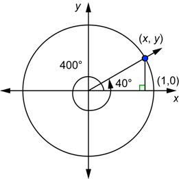 Como , el ángulo viaja una rotación completa mas otros 40°, como se muestra con la flecha curva en el diagrama. Imagina que estás en (1, 0) y caminas alrededor del círculo una vuelta completa y luego caminas un poco más para terminar en (x, y). Este punto donde el lado terminal se intersecta con el círculo unidad es el mismo punto que tendrías para un ángulo de 40°. Todas las funciones trigonométricas para estos dos ángulos son calculadas usando las coordenadas de este punto. Esto significa que
