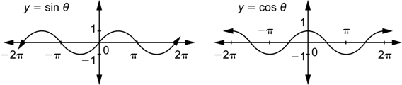 Las gráficas de seno y coseno tienen lomas y valles en un patrón repetitivo. Como éste patrón puede extenderse indefinidamente a la derecha y ala izquierda, el dominio de ambas funciones es los números reales. El rango de ambas es el intervalo .