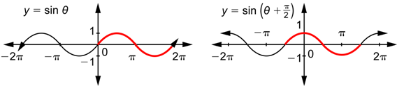 Las gráficas de seno y coseno tienen la misma forma: un patrón repetido de “loma y valle” en un intervalo en el eje horizontal que tiene longitud . Las funciones seno y coseno tienen el mismo dominio — los números reales — y el mismo rango — el intervalo de valores
