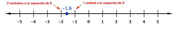 Ten cuidado al localizar los números negativos en la recta numérica. El signo negativo significa que el número está a la izquierda del 0, y el valor absoluto del número es su distancia con 0. Entonces para localizar el −1.6 en la recta numérica, debes encontrar un punto que esté a |−1.6| o 1.6 unidades a la izquierda del 0. Esto es más que 1, pero menos que 2.