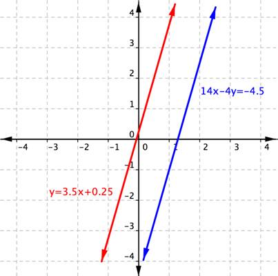 | Problem | Using the graph of y = 3.5x + 0.25 and 14x – 4y = -4.5, shown below, determine how many solutions the system has. Then classify the system as consistent or inconsistent and the equations as dependent or independent. | |