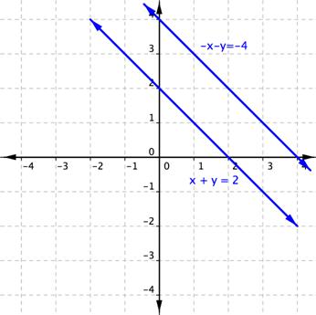 | x + y = 2 -x − y = -2 0 = 0 | Suma las ecuaciones para eliminar el término x. | |